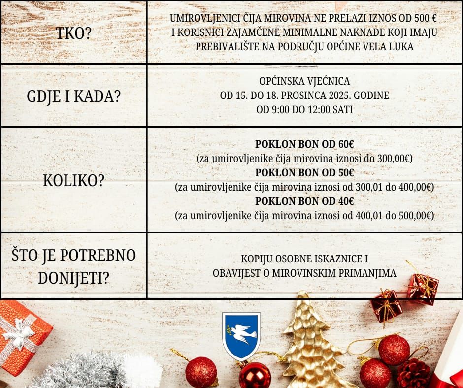 Ovom Odlukom se utvrđuje pravo na dodjelu poklon bona povodom Božićno-novogodišnjih blagdana umirovljenicima i korisnicima minimalno-zajamčene naknade sa prebivalištem na području općine Vela Luka.