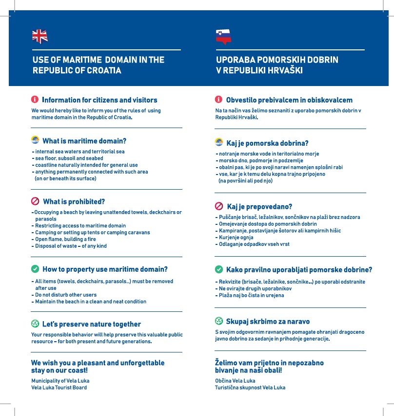 Turistička zajednica Općine Vela Luka u suradnji s Općinskim Pomorskim redarstvom je izdala letak sa zakonskim pravilima i pravilima ponašanja na pomorskom dobru.