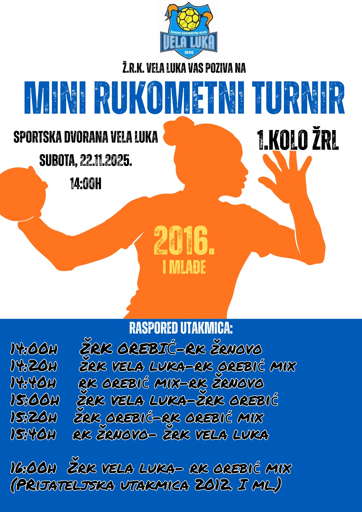 Jučer (22.11.2025.) se u Veloj Luci odigrao 1. mini rukometni turnir u sklopu županijske rukometne lige za kategoriju djevojčica i dječaka rođenih 2016.i mlađi.
