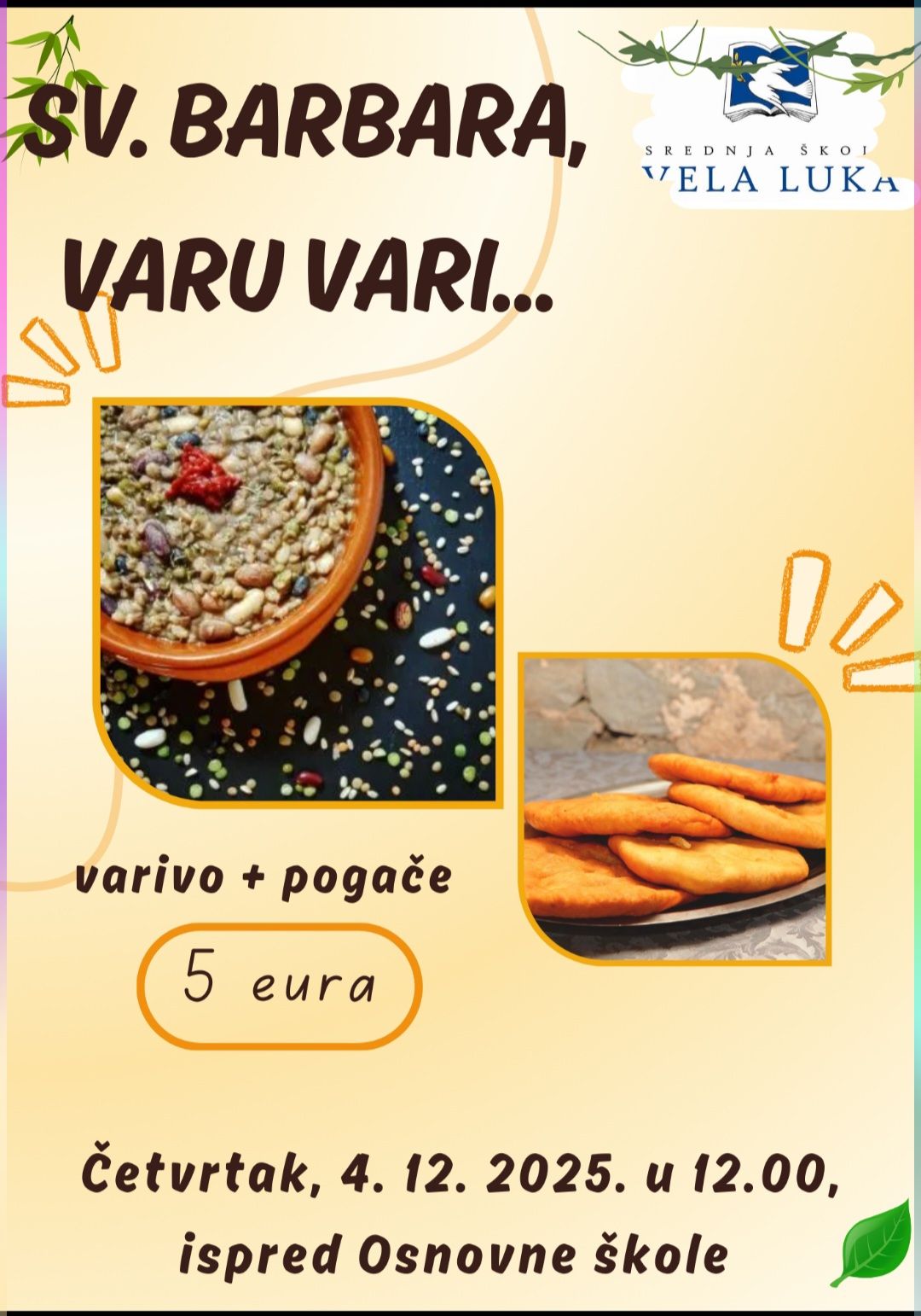 U četvrtak 4. 12. 2025. u 12.00 ispred ZADRUŽNOG DOMA štekat restorana LA SPIZA, učenici srednje škole Vela Luka (kuhari i slastičari) organiziraju prodaju variva s pogačicama. Cijena porcije (varivo +pogače) je 5 Eura.