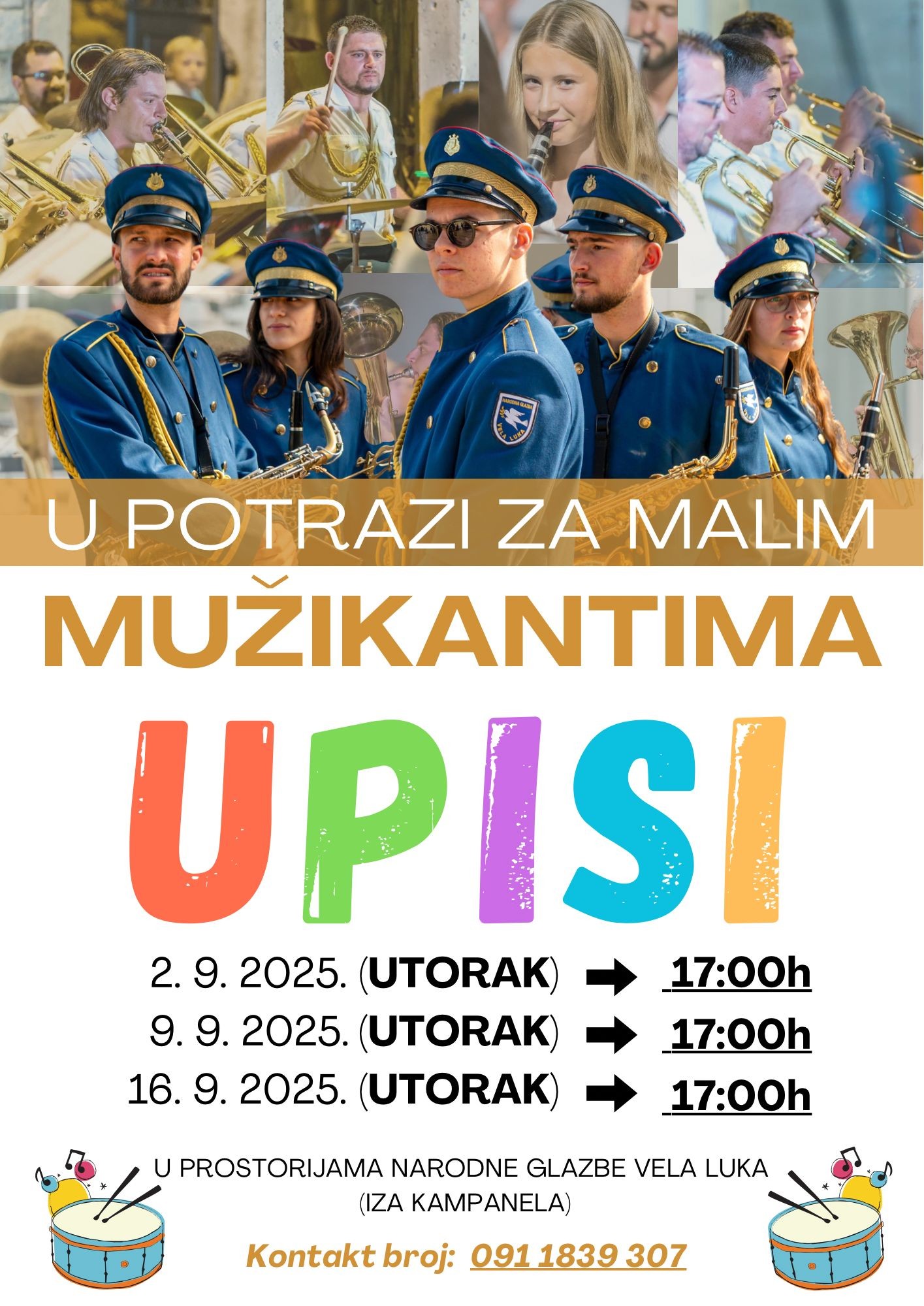 Dragi naši, kreću upisi! Pozivamo vas da dovedete svoje mališane (ili one malo starije) u bilo kojem od dolje navedenih termina kako bi izbliza upoznali instrumente,mužiku i mužikante. 🥁🎺