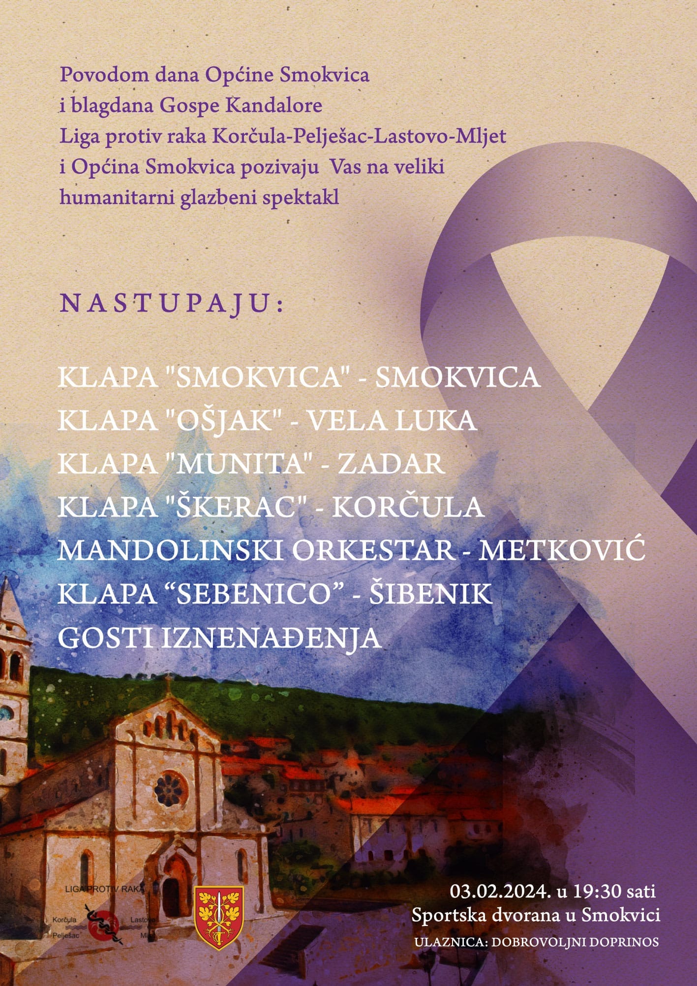 Povodom dana Općine Smokvica i blagdana Gospe Kandalora, 03. veljače (subota) s početkom u 19:30 sati u Sportskoj dvorani Smokvica održat će se humanitarno-glazbeni spektakl, čiji će prilog od dobrovoljnih doprinosa publike biti doniran Ligi protiv raka Korčula-Pelješac-Lastovo-Mljet.
