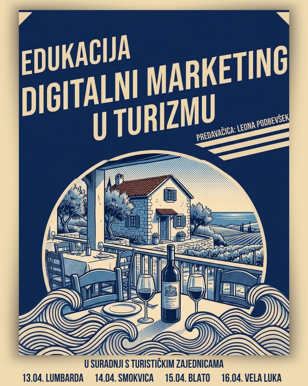 Edukaciju je vodila Leona Podbevšek, magistrica struke i vlasnica Limit Push Design studija za digitalni marketing. Događaj se održao u četvrtak, 16. travnja, u 18:30 sati u Općinskoj vijećnici u Veli Luci, a trajao je 40 minuta. Sudjelovanje je bilo besplatno.