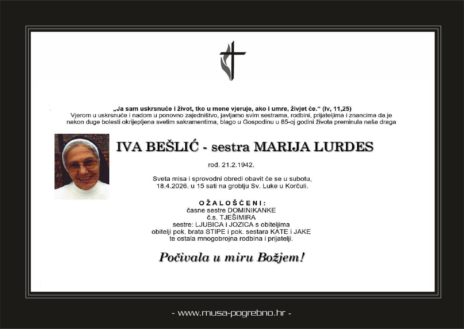 OBAVIJEST O SPROVODU s. Marije Lurdes Bešlić